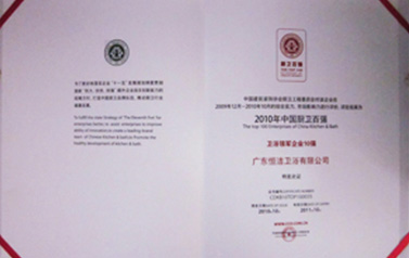 恒潔衛浴榮獲由中國建筑裝飾協會廚衛工程委員會頒發的“2009年度中國廚衛百強衛浴領軍企業10強“稱號。